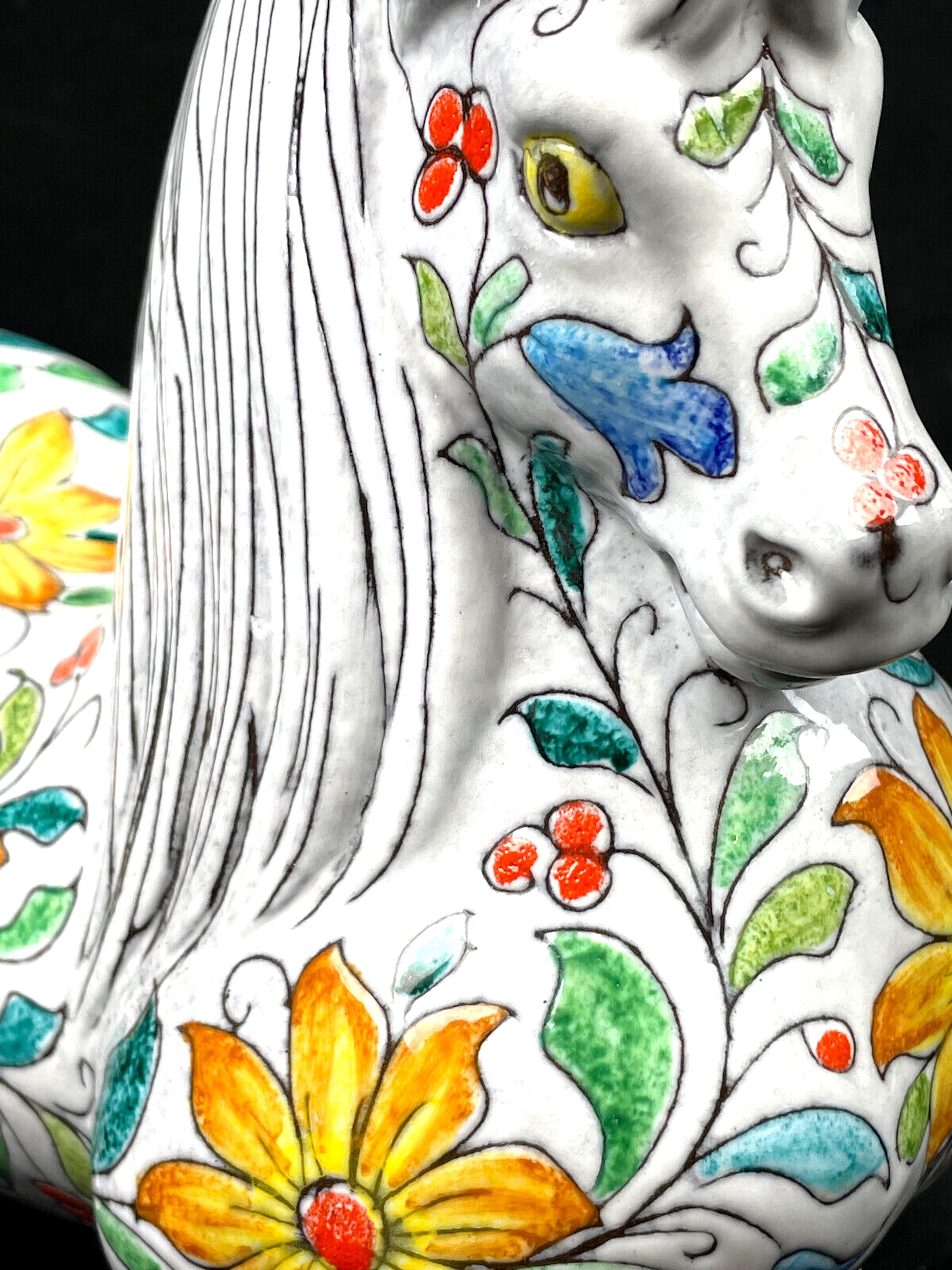 Large version of the 1960s Mancioli for Raymor Italian majolica pottery horse sculpture with bright yellow sunflower designs. Marked "Italy" on the underside. 12" long x 11.5" tall x 6" wide. See photos. Note that due to its size and risk of breakage in shipping, this item is slated for local pick-up only.