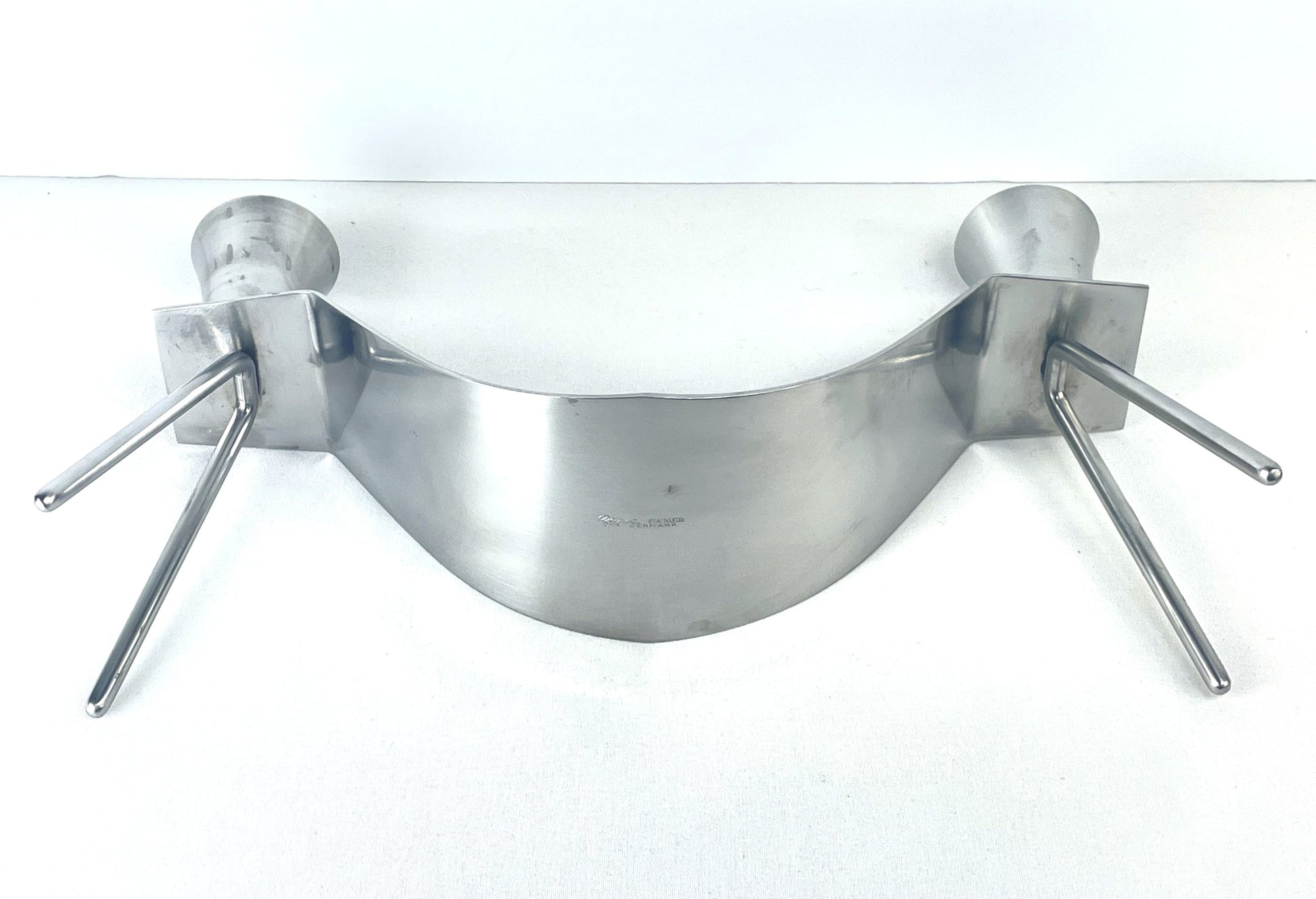 Scarce Danish Mid-Century Modern stainless steel candleholder by Dana featuring twin candle cups suspended between a bowed and footed bridge piece. Marked Dana Stainless DFA Denmark. Measures 9” wide to ends of feet and 4 5/8” tall to top of cups.
